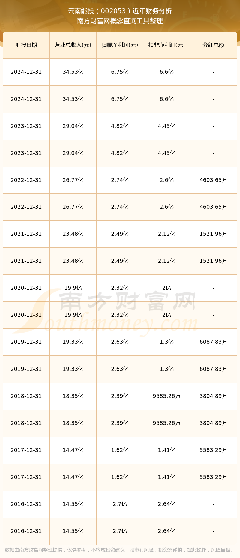 云南能投2024年總營收34.53億,同比增長18.9%;凈利潤6.75億,同比增長39.97%;銷售毛利率41.63%。