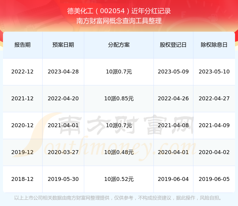 德美化工最新一次公布的分紅方案:10派0.7元。
