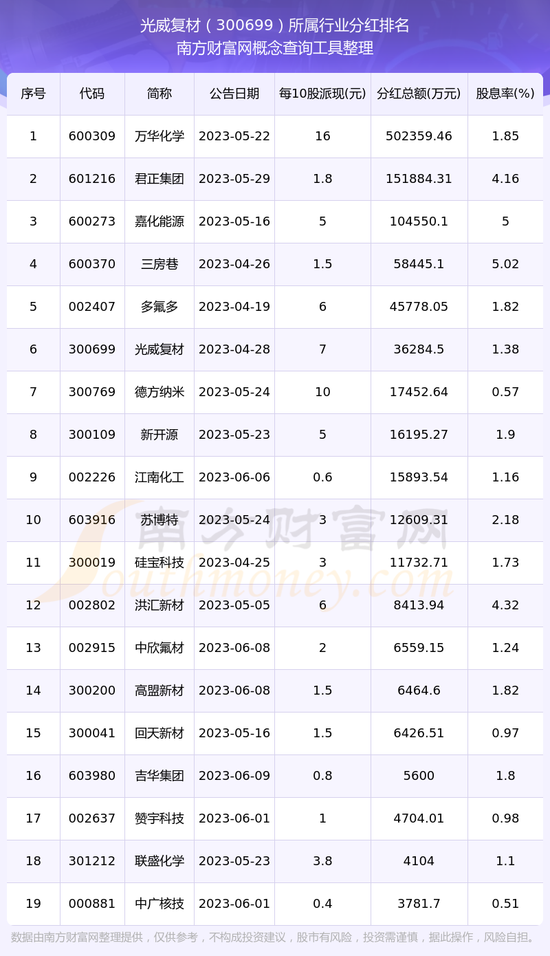 按照南方財富網趨勢選股系統統計,光威復材所屬行業(yè)為碳纖維行業(yè),碳纖維行業(yè)分紅排名情況如下表: