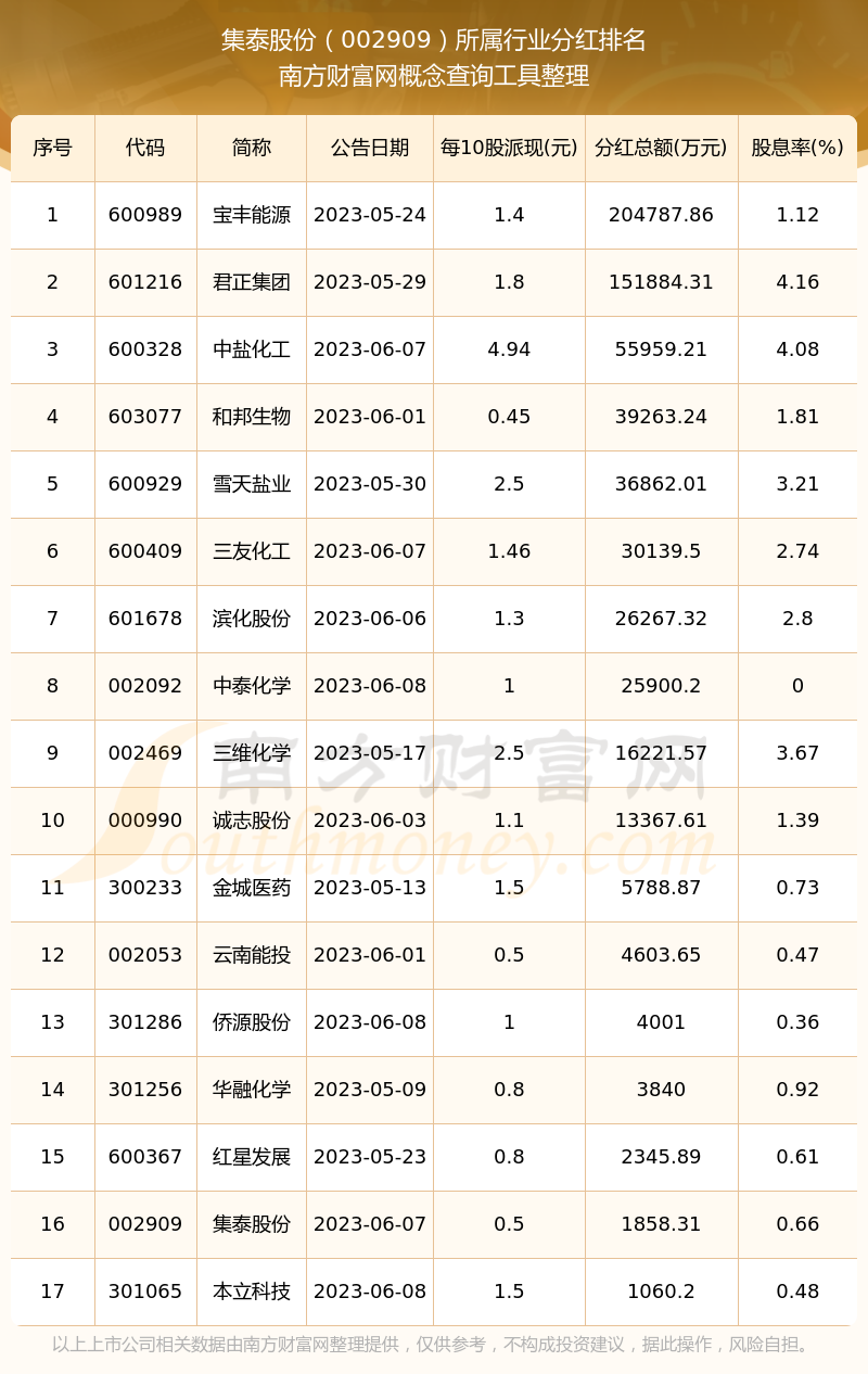 按照南方財(cái)富網(wǎng)趨勢(shì)選股系統(tǒng)統(tǒng)計(jì),集泰股份所屬行業(yè)為化學(xué)原料行業(yè),化學(xué)原料行業(yè)分紅排名情況如下表: