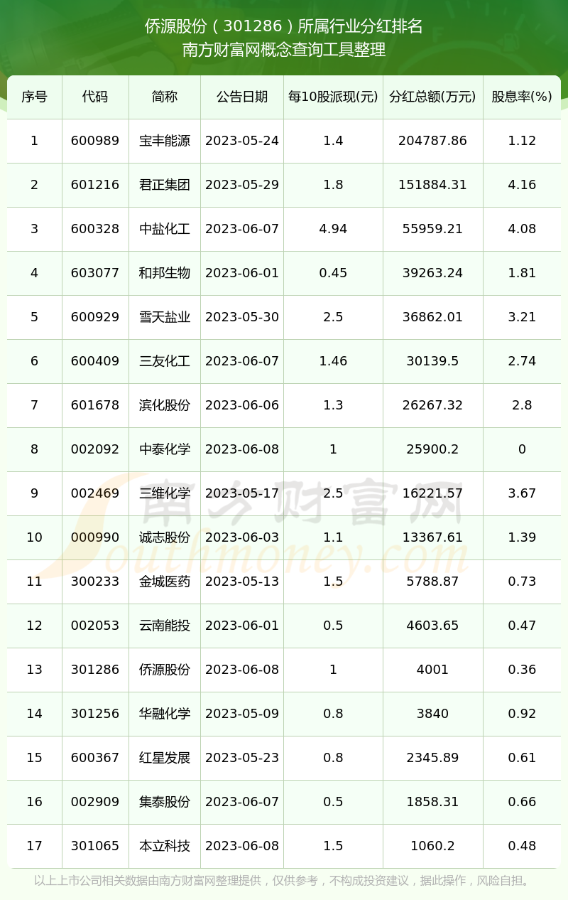 二、僑源股份301286行業(yè)分紅排名