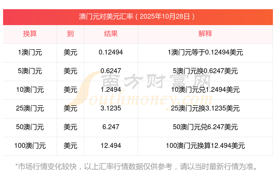 2025年10月28日匯率行情:30澳門元對美元匯率多少