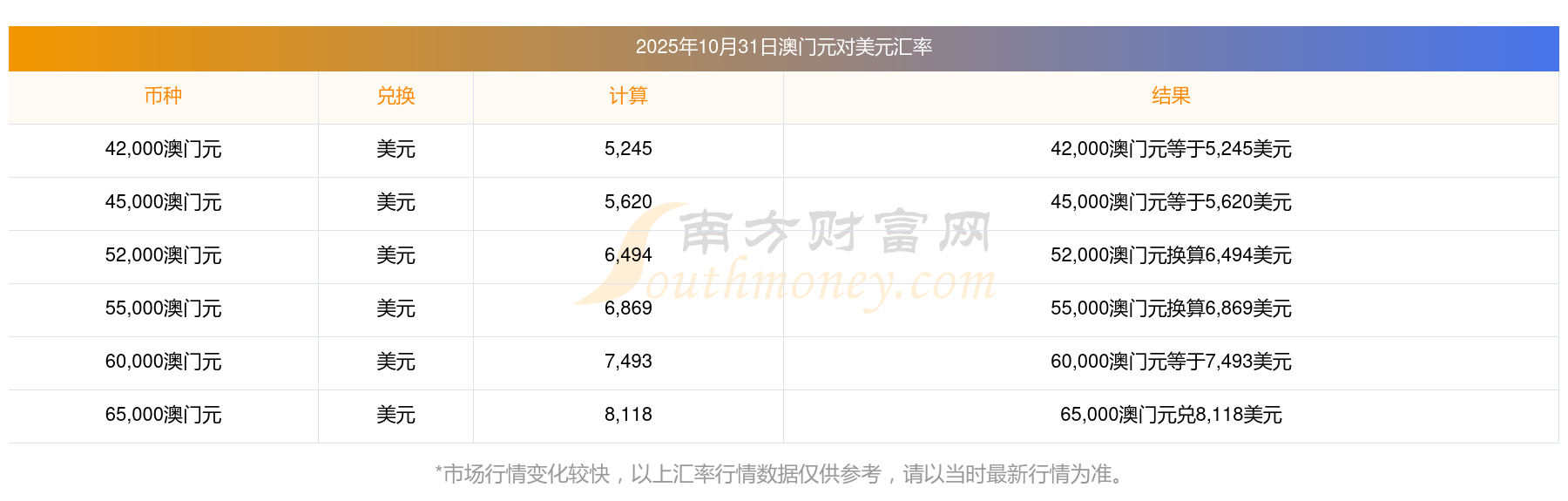 2025年10月31日匯率行情:51澳門元對美元匯率多少