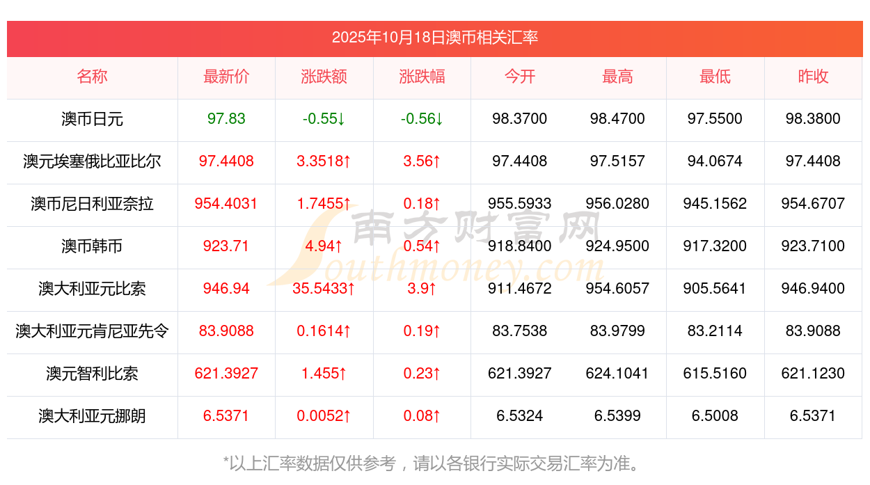 根據(jù)2025年10月18日匯率,澳幣兌換加拿大幣匯率最新0.911000,今開(kāi)0.9115,昨收0.9110,最高0.9122,最低0.9060。