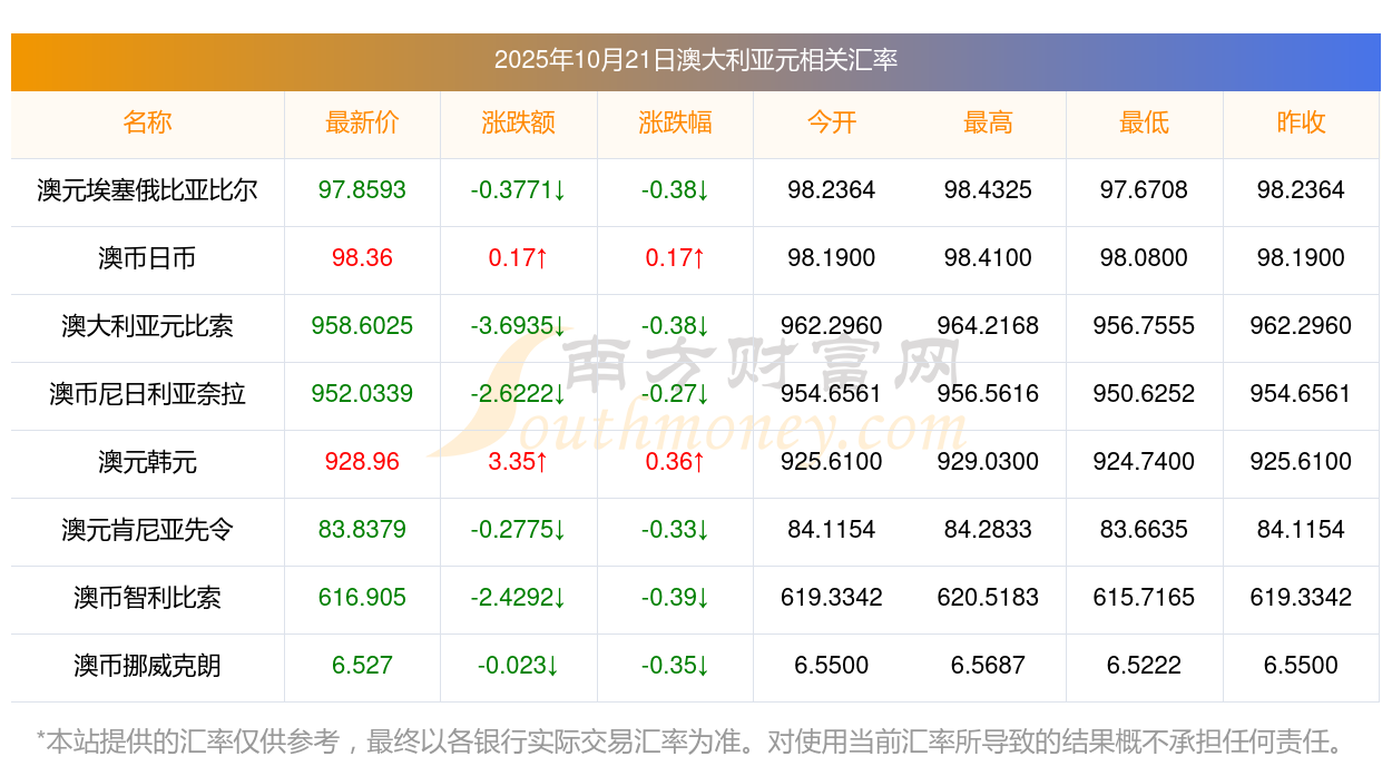 2025年10月21日澳大利亞元相關(guān)匯率查詢