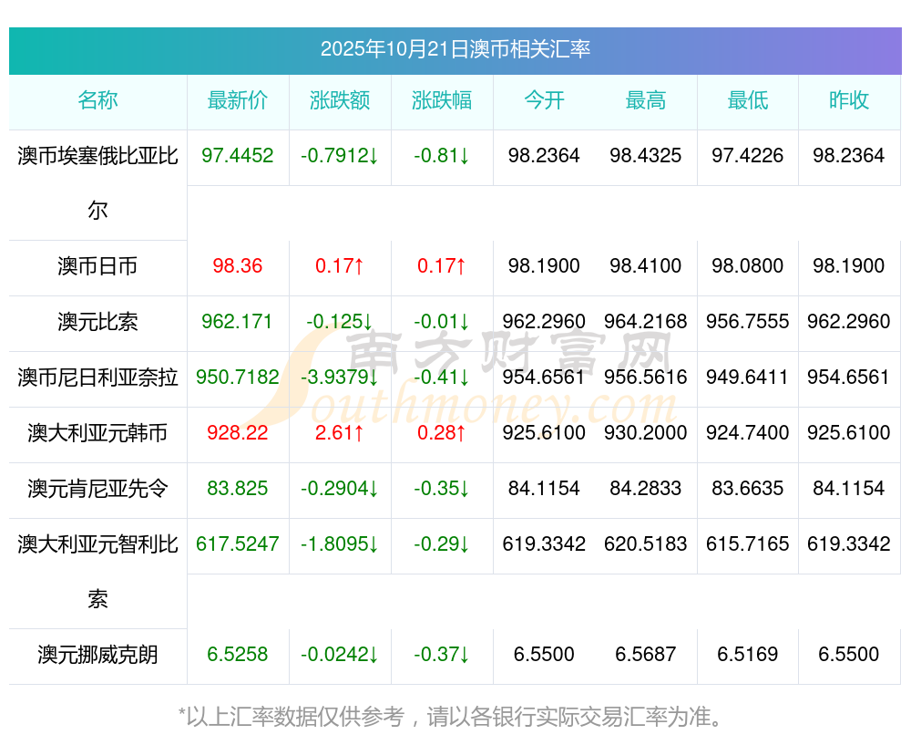 2025年10月21日澳幣相關(guān)匯率查詢