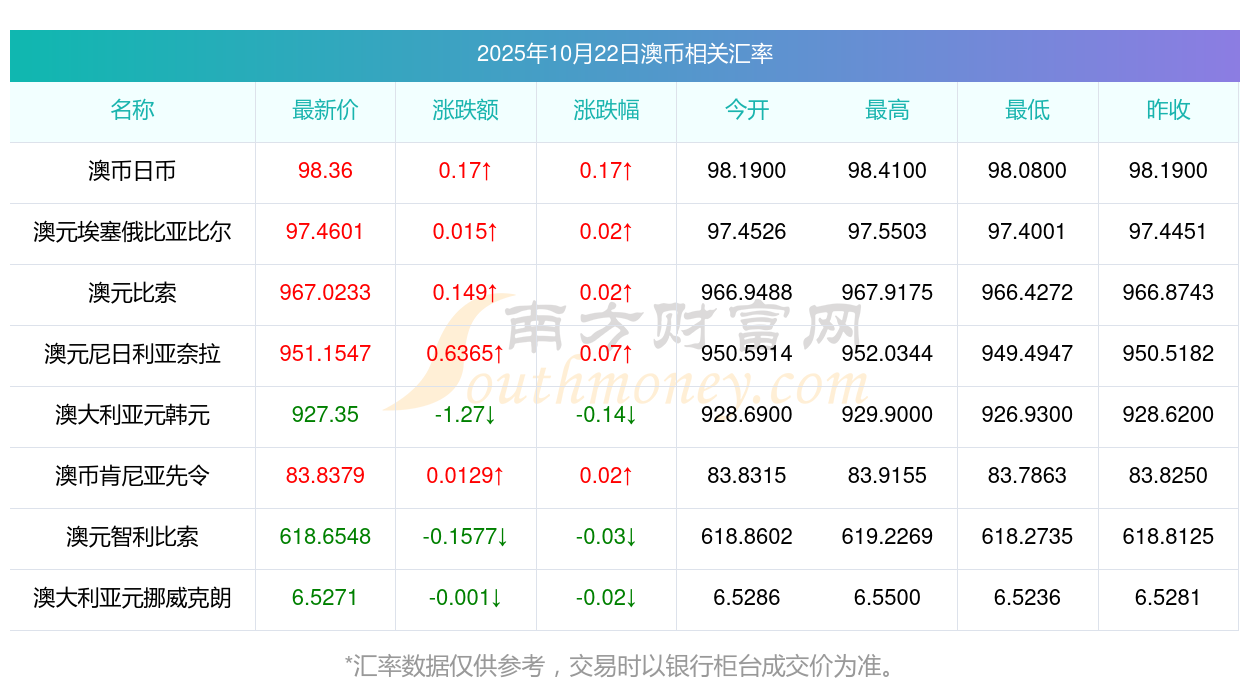 2025年10月22日澳幣相關匯率查詢