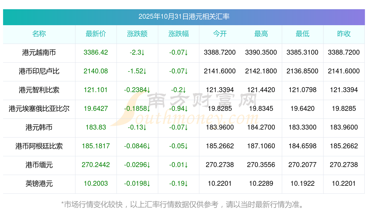 2025年10月31日最新消息,港元兌換哥倫比亞比索最新匯率為496.380000,今開為496.1500,昨收為496.1500,最高為497.3700,最低為494.6300。