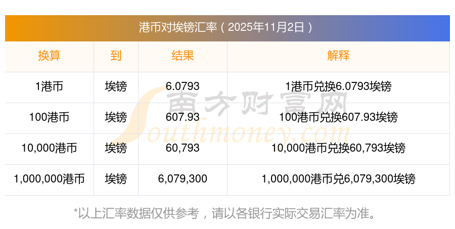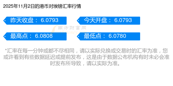 今日港幣匯價:2025年11月2日25港幣兌埃鎊匯價一覽表