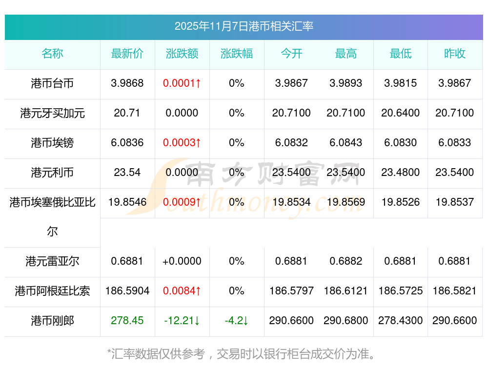根據2025年11月7日匯率,港幣兌換尼幣匯率最新價2149.500000,今開價2147.0000,昨收價2147.0300,最高價2150.2600,最低價2146.9200。