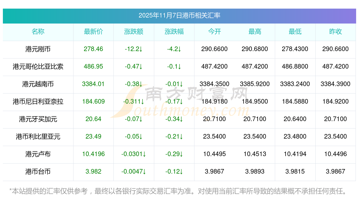 2025年11月7日港幣相關(guān)匯率查詢