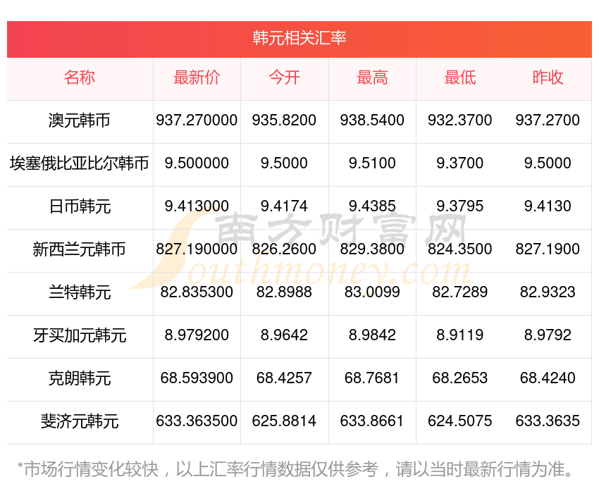 南方財富網(wǎng)為您提供韓元對日元匯率最新價格詳情。