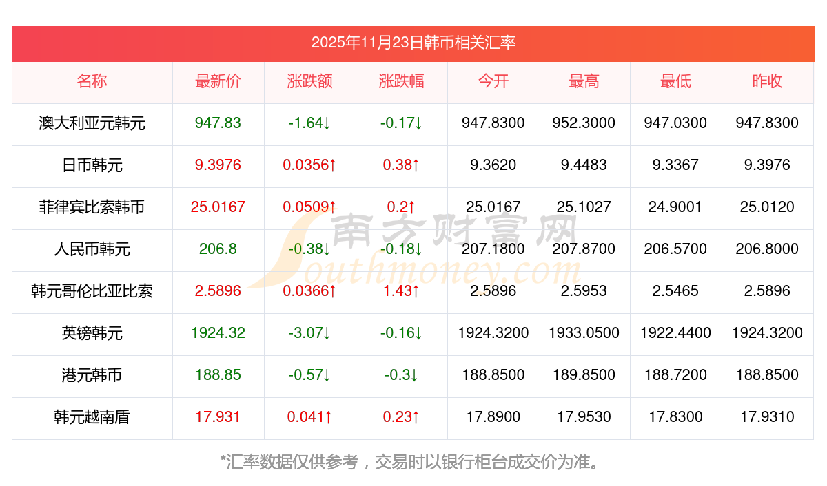2025年11月23日韓幣兌換摩洛哥迪拉姆最新匯率:0.006315,今開(kāi):0.0063,昨收:0.0063,最高:0.0063,最低:0.0063。