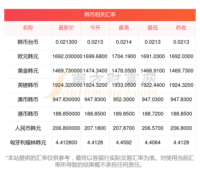 南方財富網(wǎng)為您提供韓幣對日元匯率最新價格詳情。