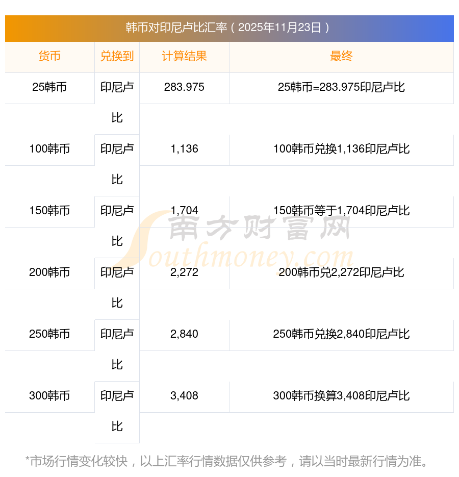 2025年11月23日新的韓幣兌印尼盧比外匯實時匯率