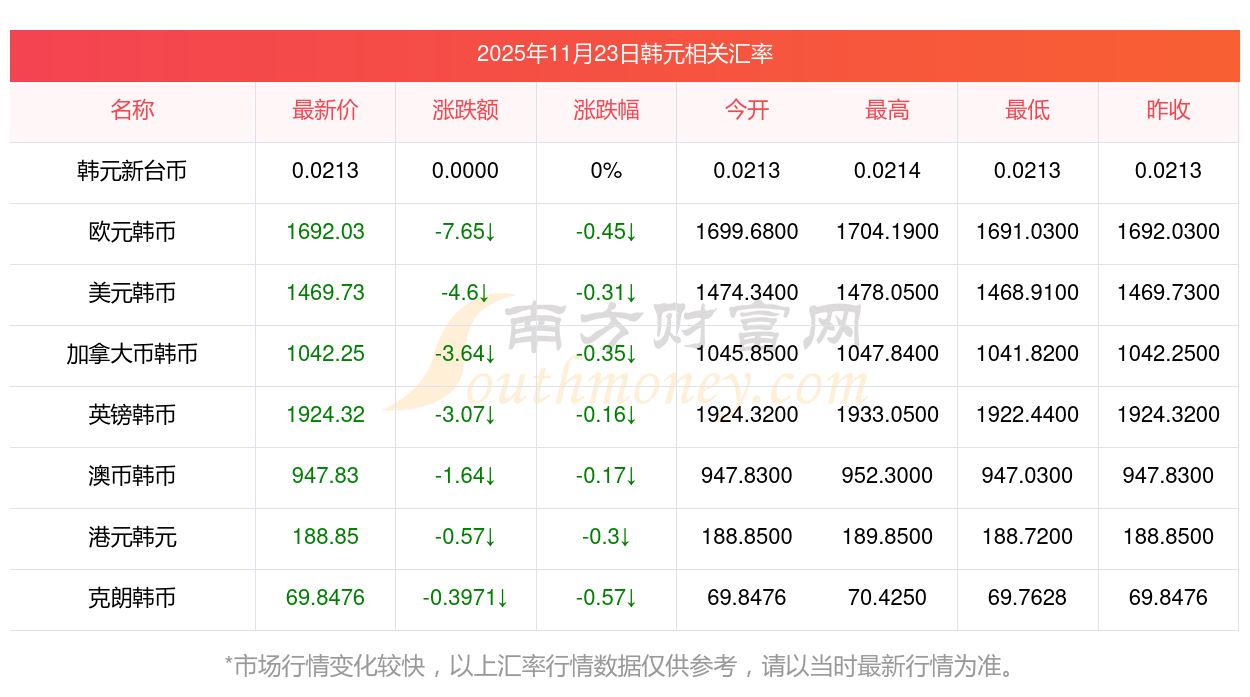 2025年11月23日最新消息,韓元兌換緬幣最新匯率為1.428800,今開為1.4244,昨收為1.4288,最高為1.4296,最低為1.4208。