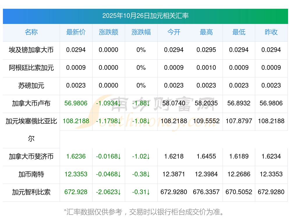 加元對(duì)剛郎匯率行情一覽表(2025年10月26日)