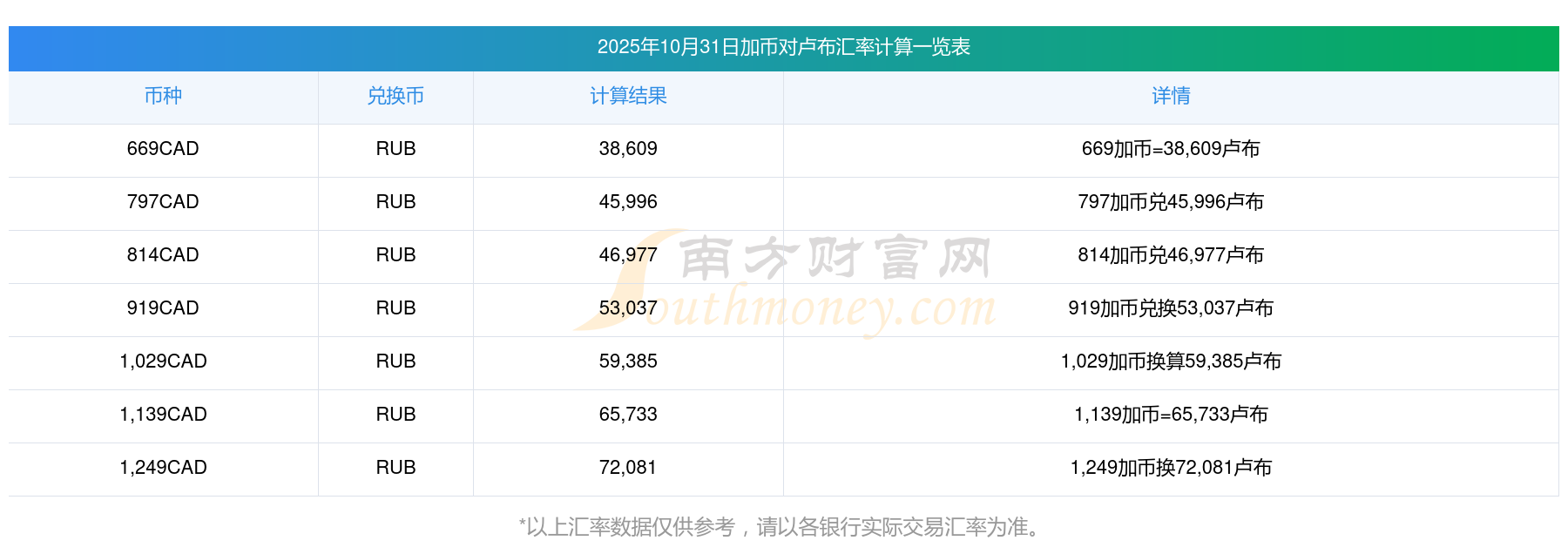 2025年10月31日盧布換加幣的匯率為:0.01733