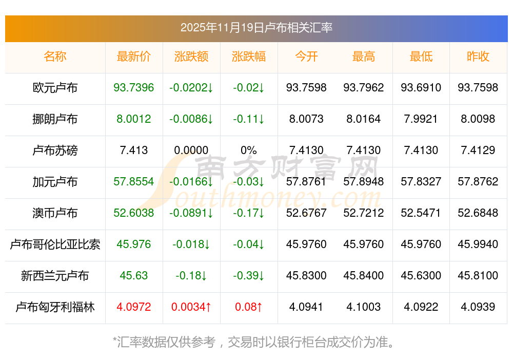 根據(jù)2025年11月19日匯率,盧布兌換紅比索匯率最新價0.296441,今開價0.0000,昨收價0.2964,最高價0.0000,最低價0.0000。