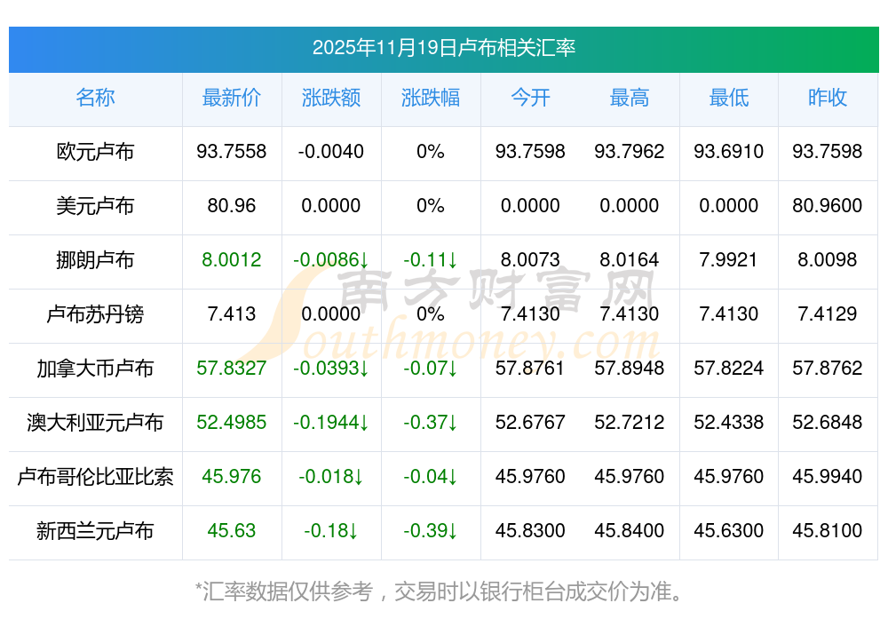 南方財(cái)富網(wǎng)為您提供盧布對(duì)人民幣匯率最新價(jià)格詳情。