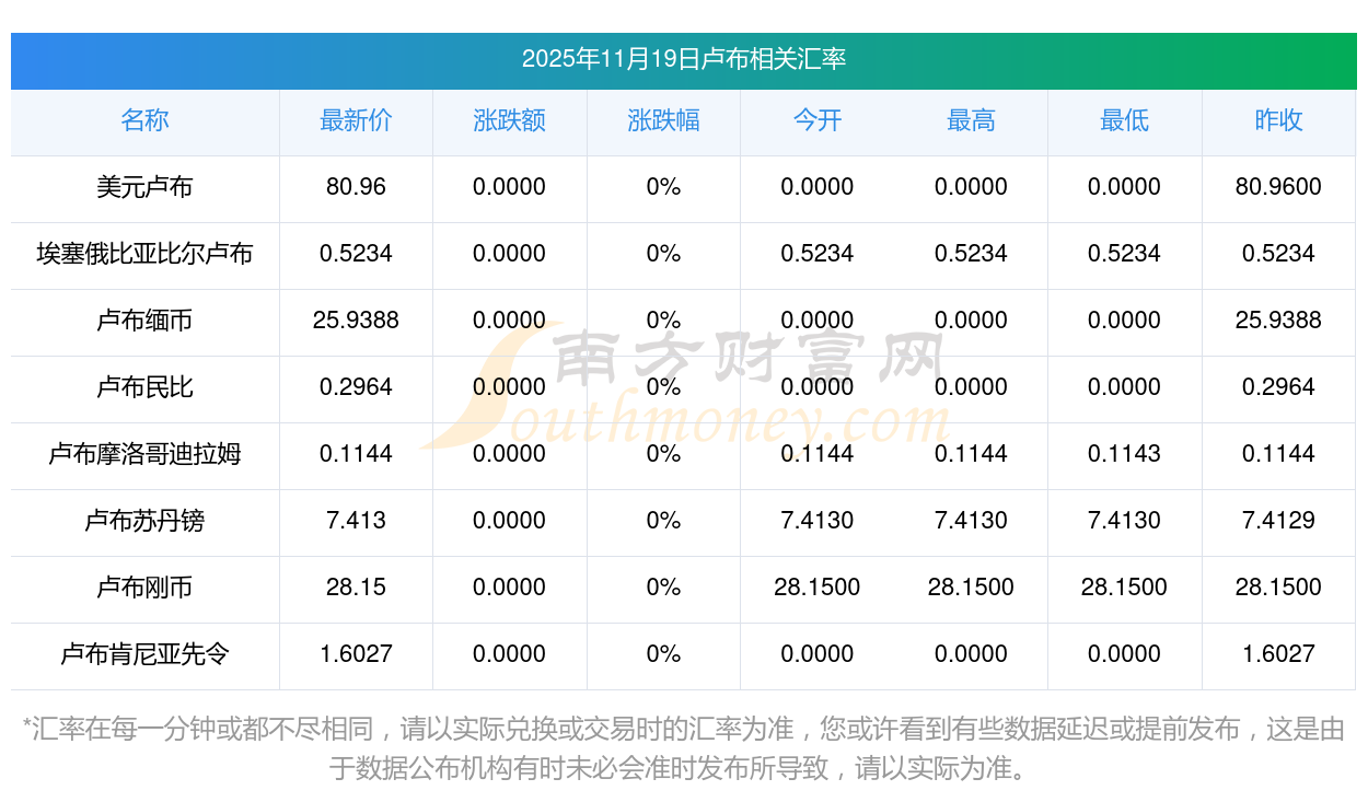根據(jù)2025年11月19日匯率,盧布兌換南特匯率最新0.212200,今開0.2123,昨收0.2123,最高0.2126,最低0.2121。