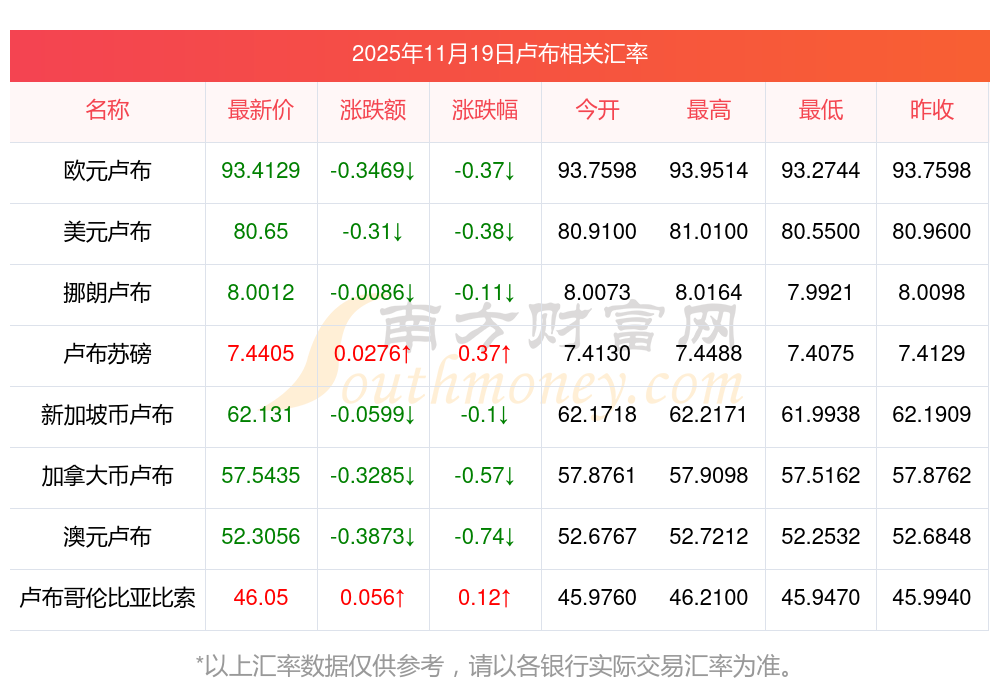 根據(jù)2025年11月19日匯率,盧布兌換韓幣匯率最新價(jià)18.184500,今開價(jià)18.0260,昨收價(jià)18.0261,最高價(jià)18.2217,最低價(jià)17.9974。