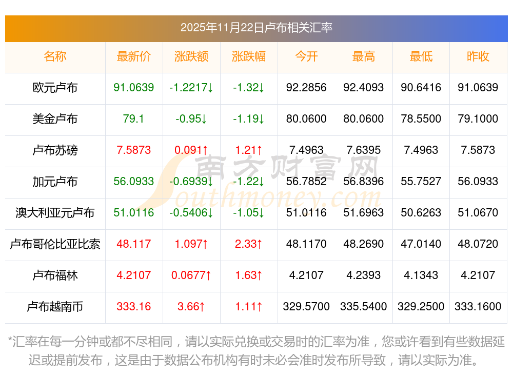 根據(jù)2025年11月22日匯率計算,RUB兌換PLN匯率最新價0.046600:今日開價0.0459,昨日收價0.0466,最高價0.0469,最低價0.0458。