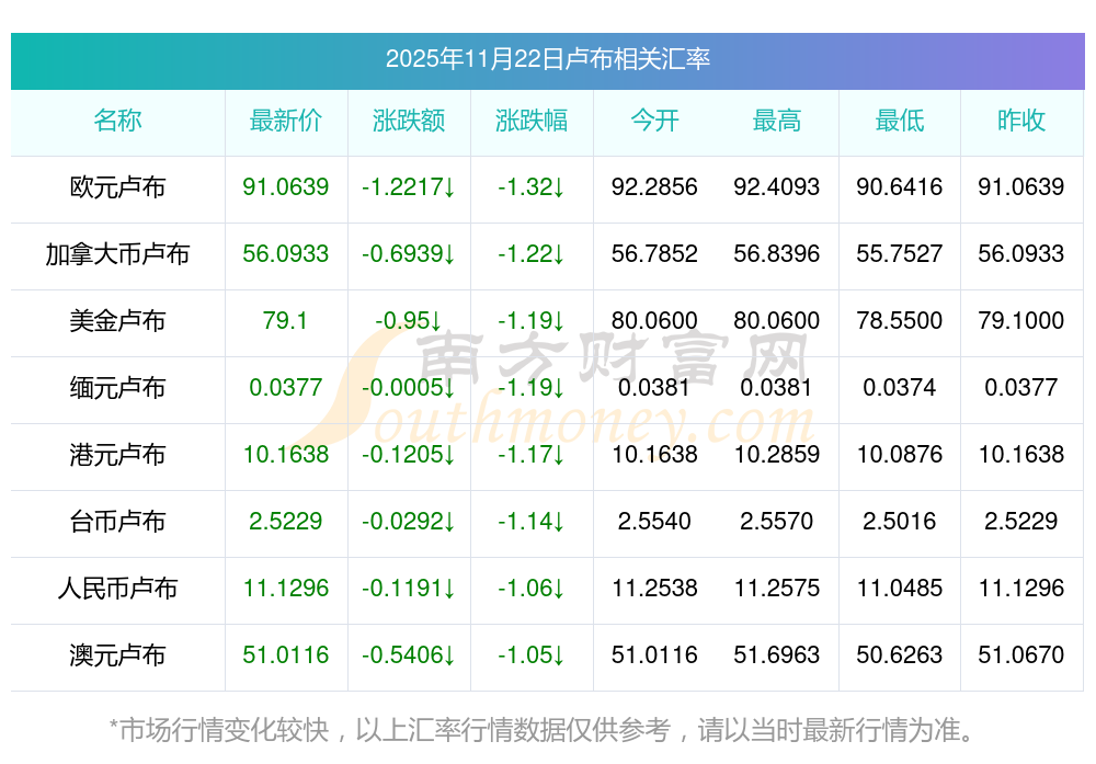 根據(jù)2025年11月22日匯率,盧布兌換捷克幣匯率最新價0.266018,今開價0.2660,昨收價0.2660,最高價0.2674,最低價0.2618。