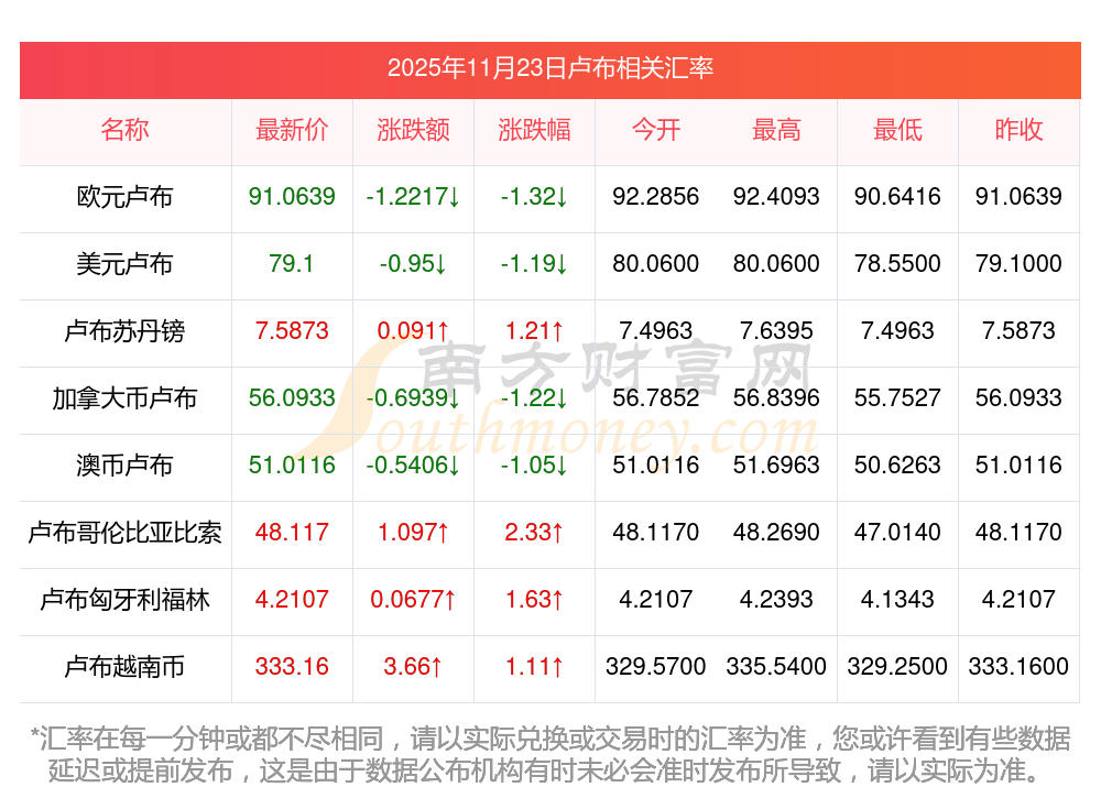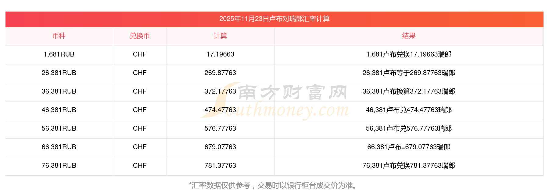 不同貨幣兌換比率 今天盧布兌瑞郎新匯率價多少?(2025-11-23)