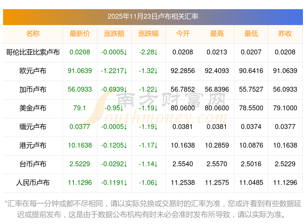 根據(jù)2025年11月23日匯率,盧布兌換秘魯新索爾匯率最新0.042819,今開0.0422,昨收0.0428,最高0.0430,最低0.0422。