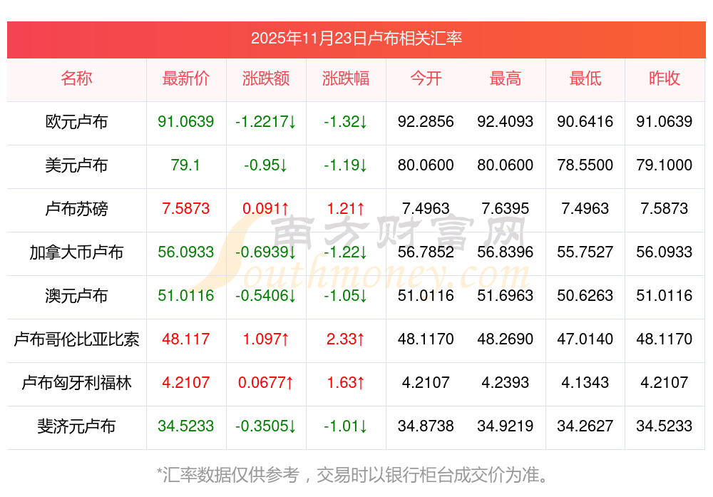 根據(jù)2025年11月23日匯率,盧布兌換瑞郎匯率最新價(jià)0.010230,今開價(jià)0.0102,昨收價(jià)0.0102,最高價(jià)0.0103,最低價(jià)0.0100。