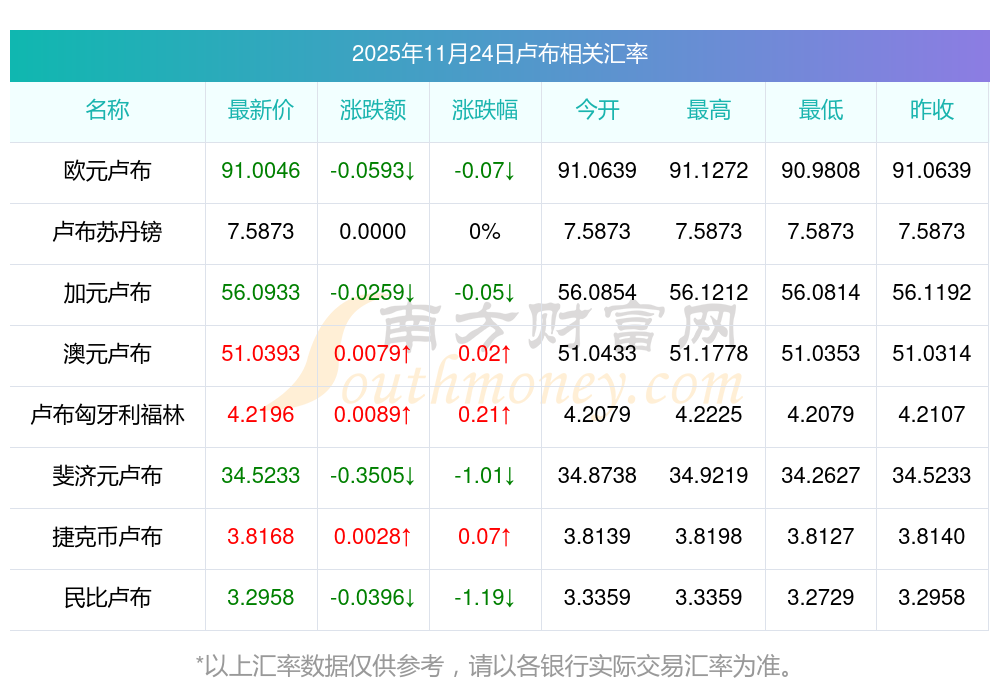 根據(jù)2025年11月24日匯率計算,RUB兌換NZD匯率最新價0.022550:今日開價0.0225,昨日收價0.0225,最高價0.0226,最低價0.0225。