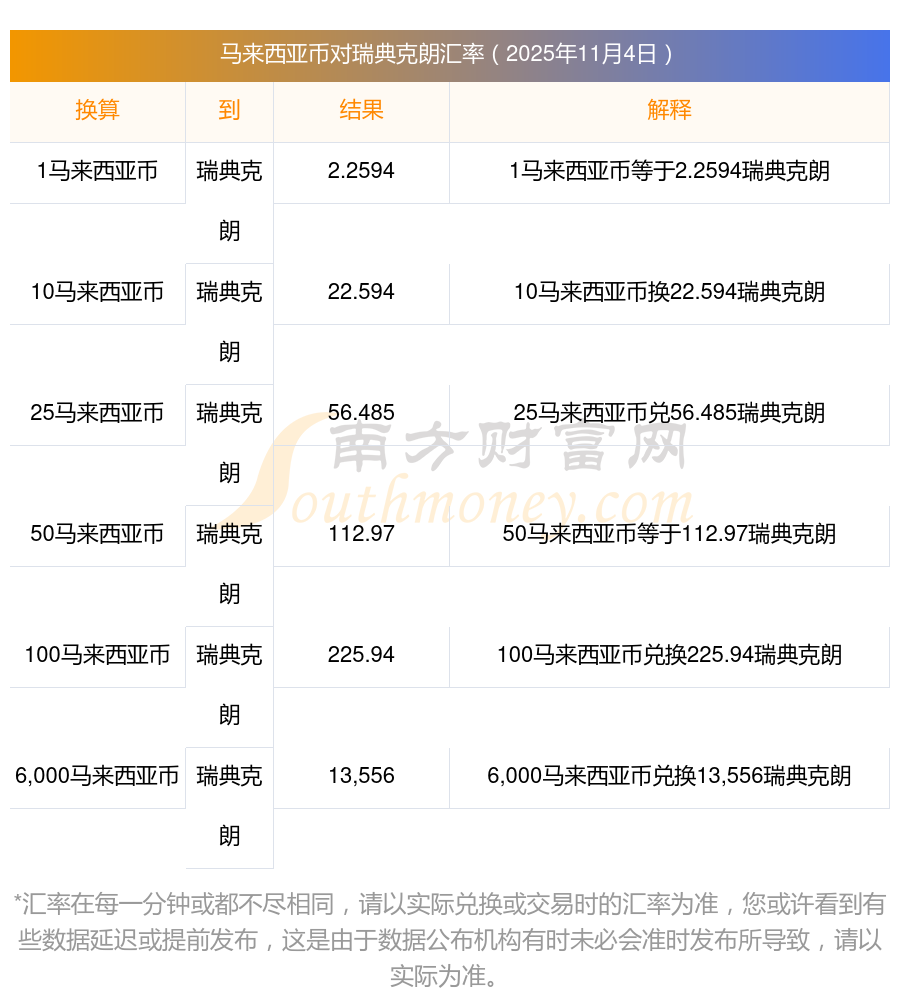 今日結匯行情:馬來西亞幣對瑞典克朗匯率表11月4日