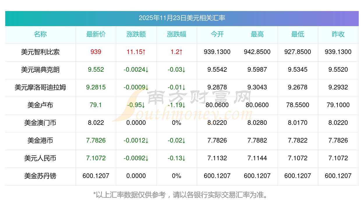 根據(jù)2025年11月23日匯率計算,USD兌換PHP匯率最新價58.750000,今開價58.7500,昨收價58.7610,最高價59.0680,最低價58.6980。
