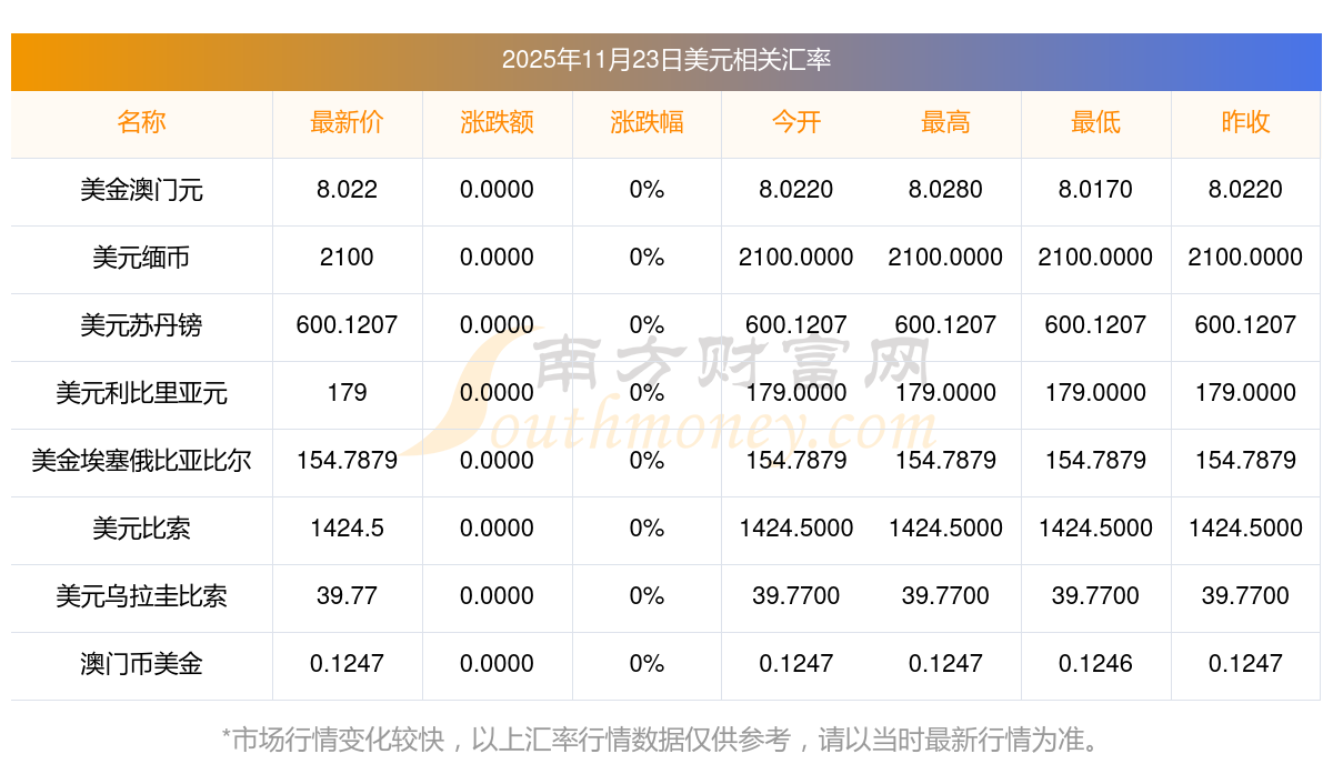 根據(jù)2025年11月23日匯率,美元兌換盧布匯率最新價79.100000,今開價80.0600,昨收價79.1000,最高價80.0600,最低價78.5500。