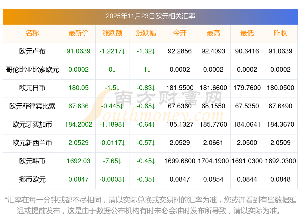 2025年11月23日最新消息,歐元兌換比索最新匯率為21.273700,今開為21.2636,昨收為21.2636,最高為21.3350,最低為21.1723。