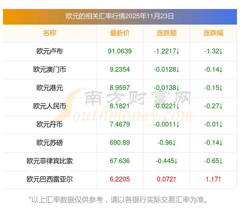 根據(jù)2025年11月23日匯率,歐元兌換加幣匯率最新1.623500,今開1.6251,昨收1.6235,最高1.6283,最低1.6211。