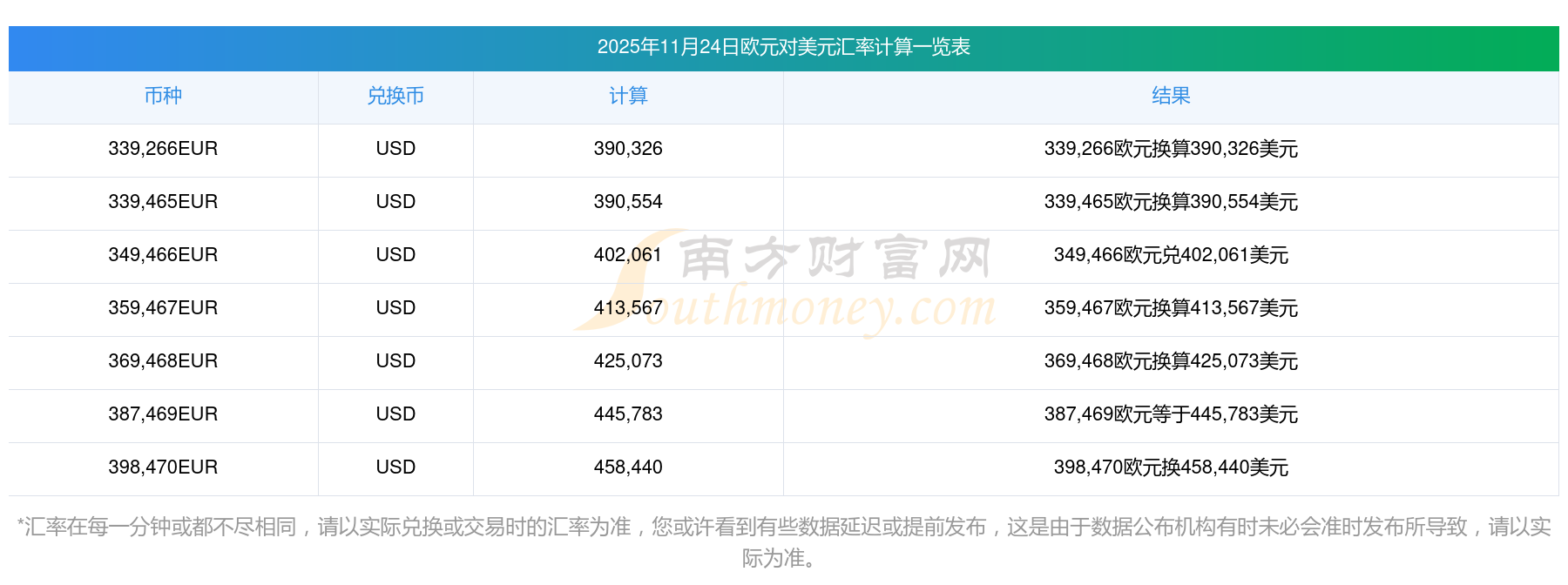 現(xiàn)在1歐元與美元的匯率是多少?2025年11月24日