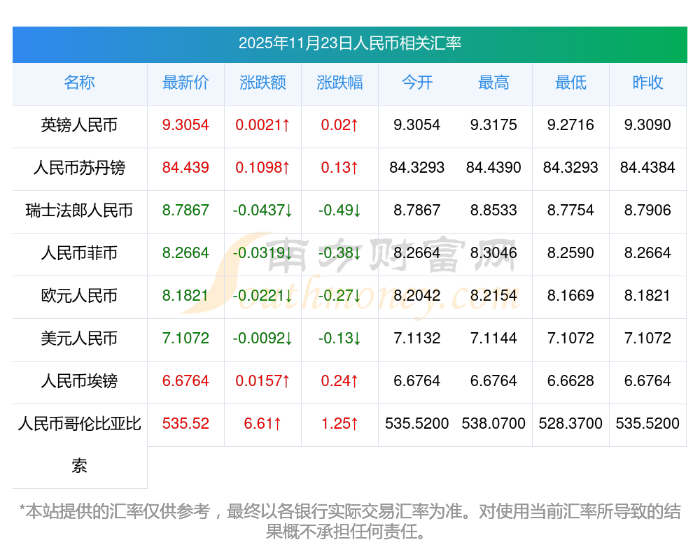 2025年11月23日最新消息,人民幣兌換新西蘭幣最新匯率為0.250900,今開為0.2509,昨收為0.2509,最高為0.2519,最低為0.2505。