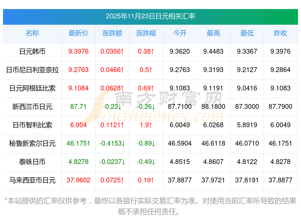根據(jù)2025年11月23日匯率計(jì)算,JPY兌換CAD匯率最新價(jià)0.009017:今日開(kāi)價(jià)0.0090,昨日收價(jià)0.0090,最高價(jià)0.0090,最低價(jià)0.0089。
