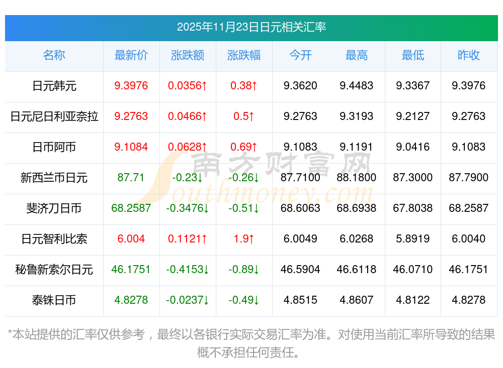 根據(jù)2025年11月23日匯率,日元兌換墨西哥比索匯率最新價(jià)0.118160,今開(kāi)價(jià)0.1181,昨收價(jià)0.1182,最高價(jià)0.1186,最低價(jià)0.1166。