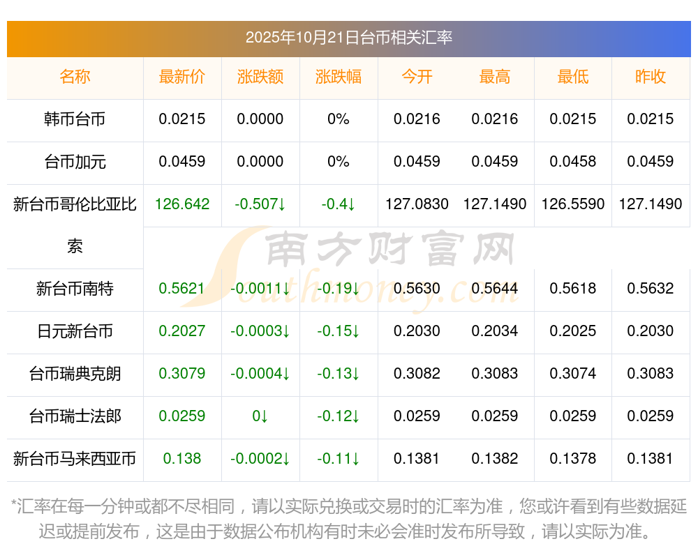 根據(jù)2025年10月21日匯率計算,TWD兌換CHF匯率最新價0.025874: