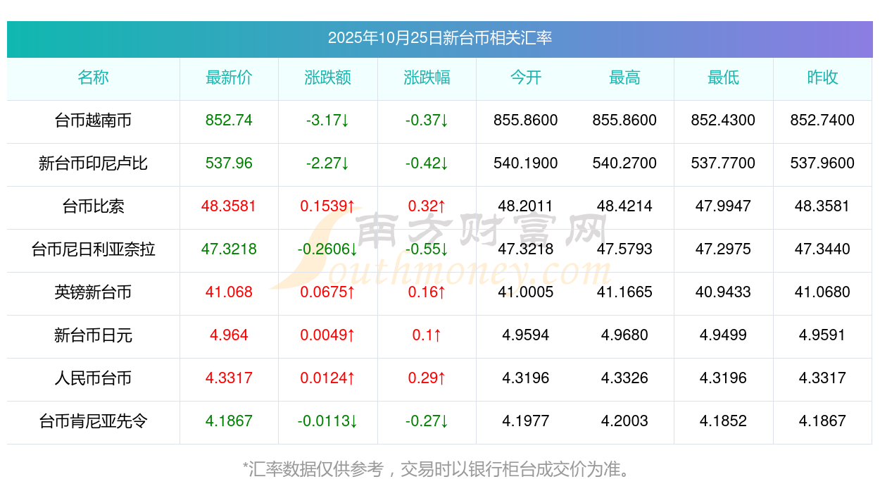 2025年10月25日新臺(tái)幣相關(guān)匯率查詢