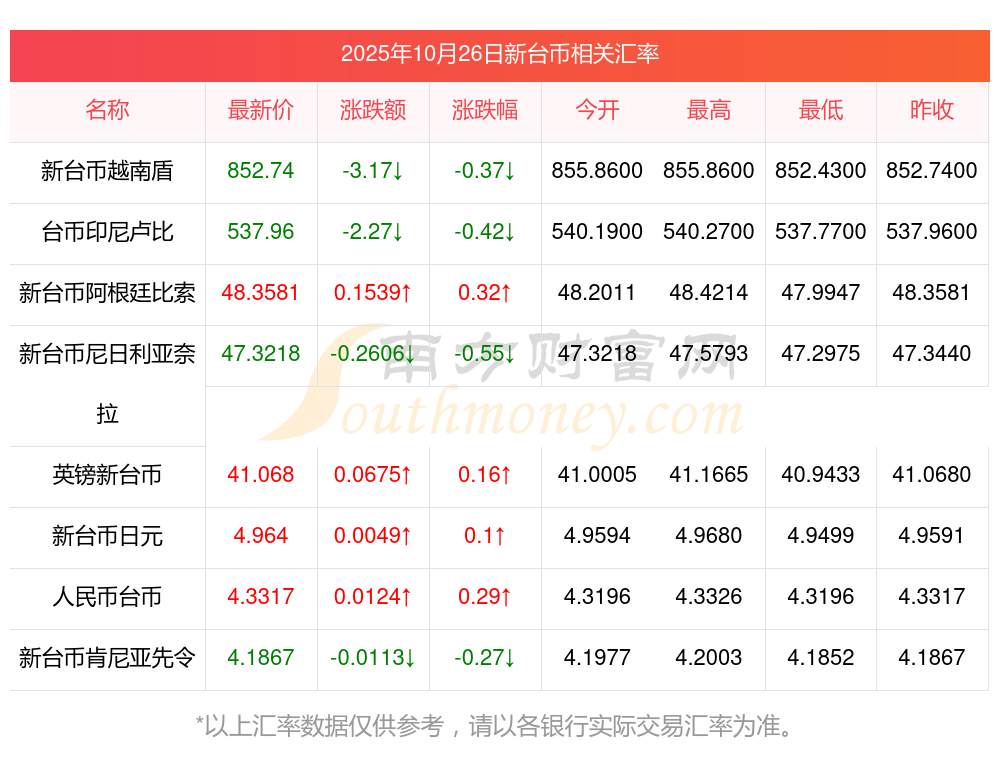 2025年10月26日新臺幣相關(guān)匯率查詢