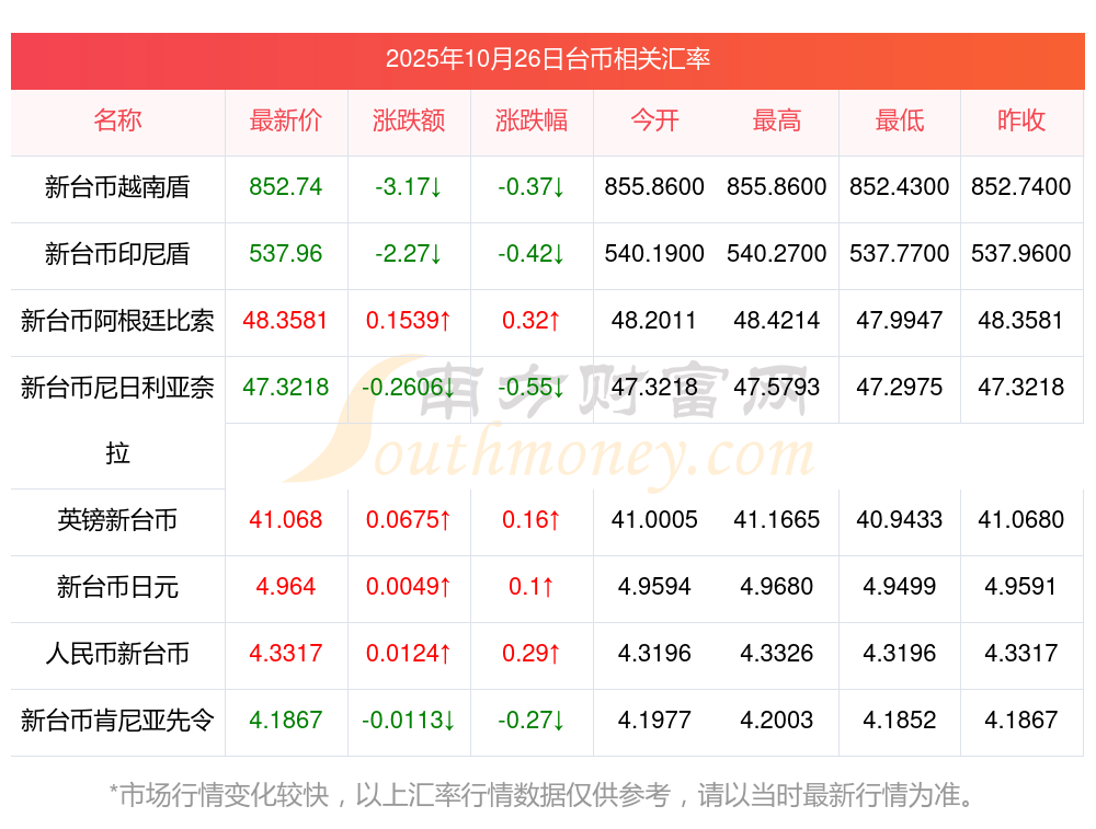 根據(jù)2025年10月26日匯率計算,TWD兌換FJD匯率最新價0.073660,今開價0.0746,昨收價0.0737,最高價0.0746,最低價0.0736。