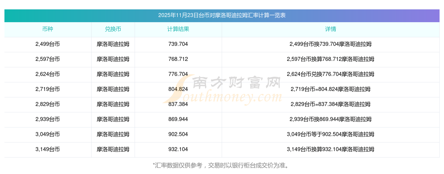 南方財(cái)富網(wǎng)為您提供臺幣對摩洛哥迪拉姆匯率最新價(jià)格詳情。