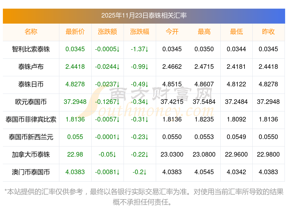 根據(jù)2025年11月23日匯率,泰銖兌換港元匯率最新價(jià)0.240300,今開(kāi)價(jià)0.2403,昨收價(jià)0.2403,最高價(jià)0.2406,最低價(jià)0.2393。