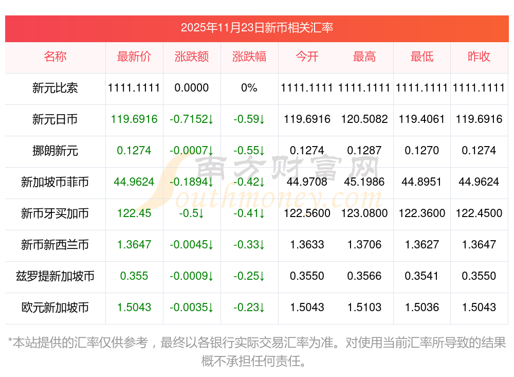 根據(jù)2025年11月23日匯率,新幣兌換利比里亞元匯率最新價136.990000,今開價136.9900,昨收價136.9900,最高價137.0100,最低價136.6700。