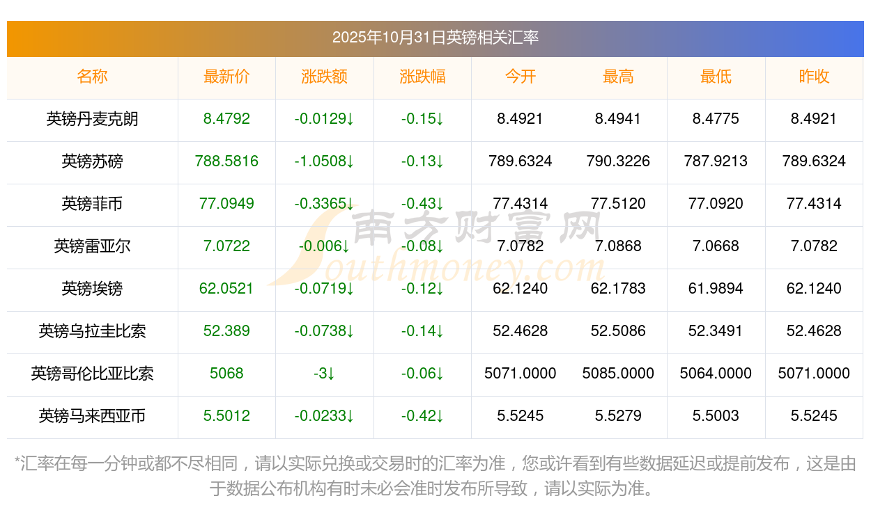 根據(jù)2025年10月31日匯率,英鎊兌換泰銖匯率最新42.431000,今開42.5980,昨收42.5980,最高42.6350,最低42.3940。