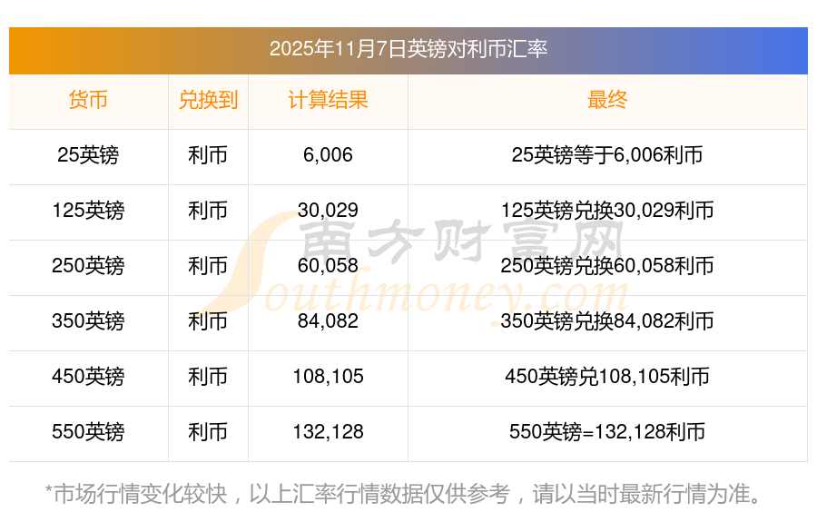 今天匯率更新!2025年11月7日98英鎊兌換利幣是多少?